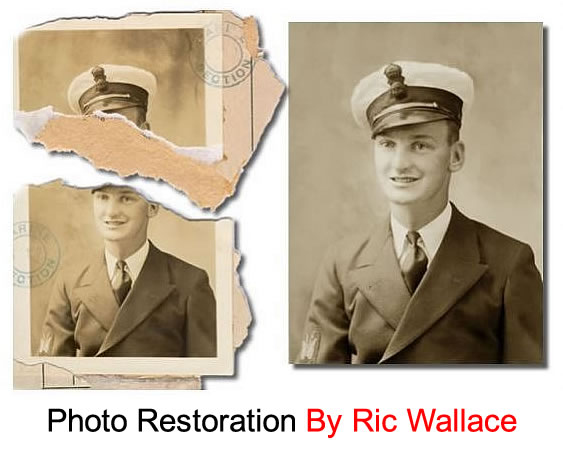 | Old, torn and sometimes photos in two or more pieces can be restored to their original state or better. Ric Wallace does a high resolution scan from your original image and electronically uses a computer to do the retouching and corrections. High quality photographic prints can be obtained from the computer file. The computer file can be supplied on CD/ DVD, USB, or downloaded from the internet to ensure exact copies can be made for years to come, with no loss in quality like prints made from negatives which will degrade over time. |